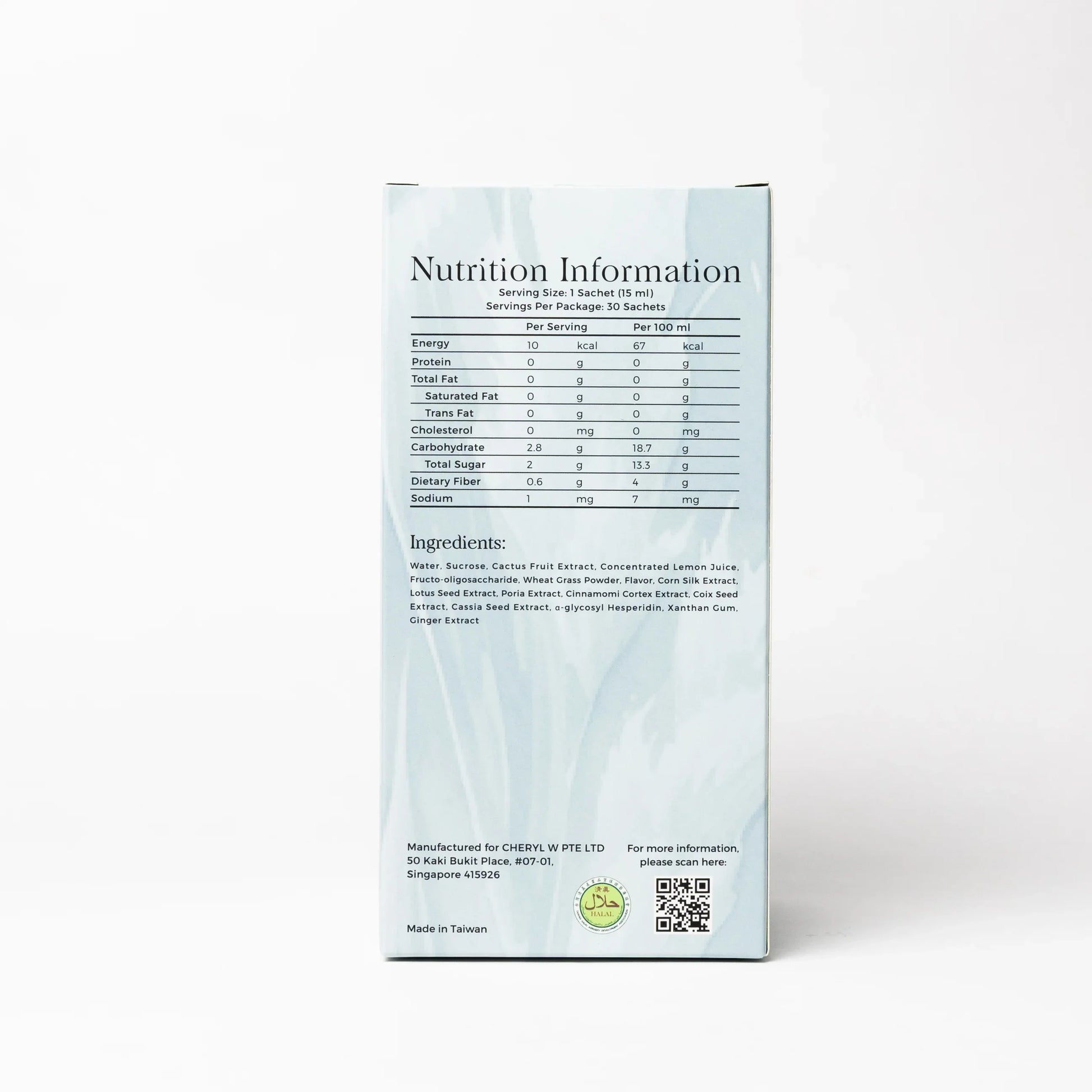 Water, Sucrose, Cactus Fruit Extract, Concentrated Lemon Juice, Fructooligosaccharide, Wheat Grass Powder, Flavour, Corn Silk Extract, Lotus Seed Extract, Poria Extract, Cinnamomi Cortex Extract, Coix Seed Extract, Cassia Seed Extract, α-glycosyl Hesperidin, Xanthan Gum, Ginger Extract.