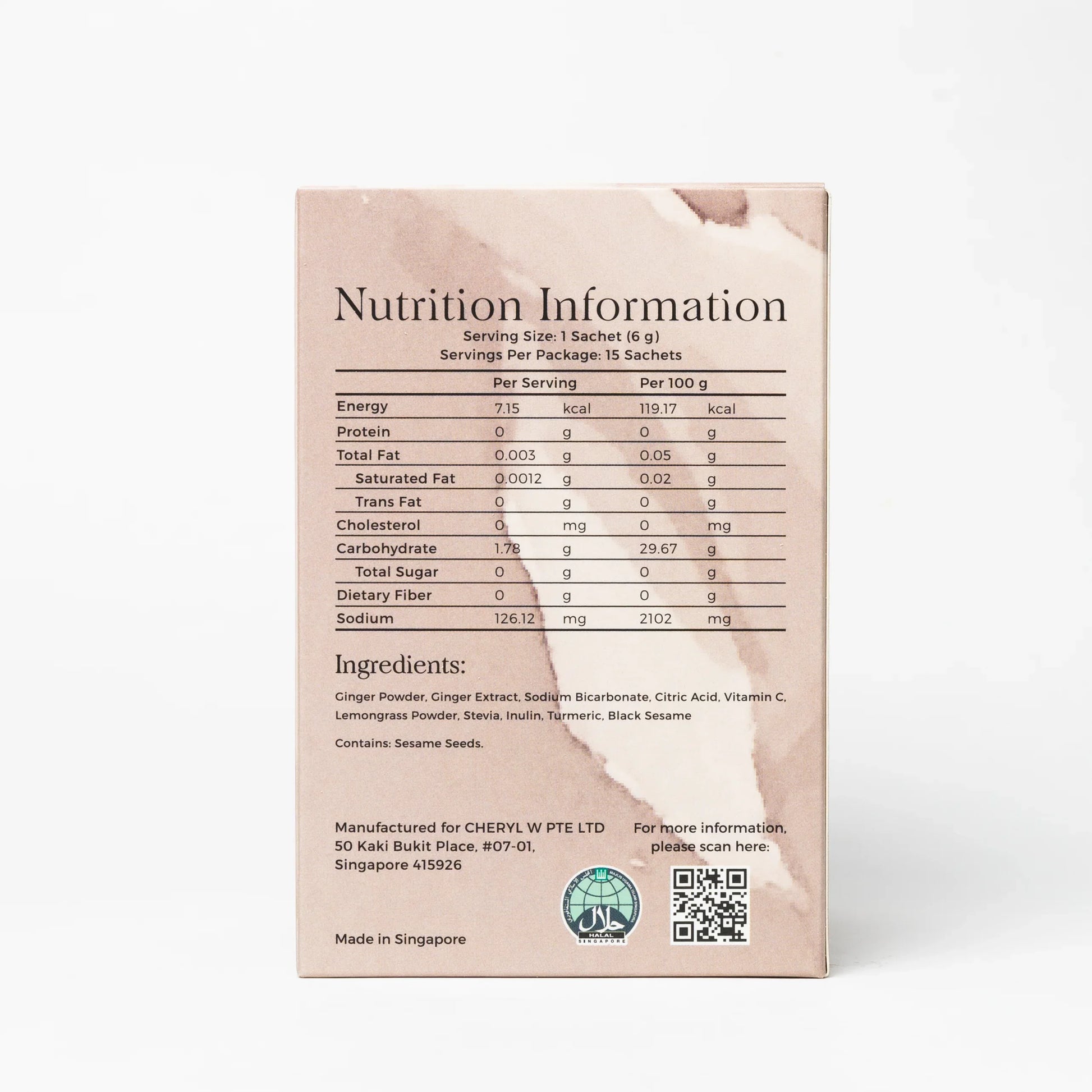 Ginger Powder, Ginger Extract, Sodium Bicarbonate, Citric Acid, Vitamin C, Lemongrass Powder, Stevia, Inulin, Turmeric, Black Sesame